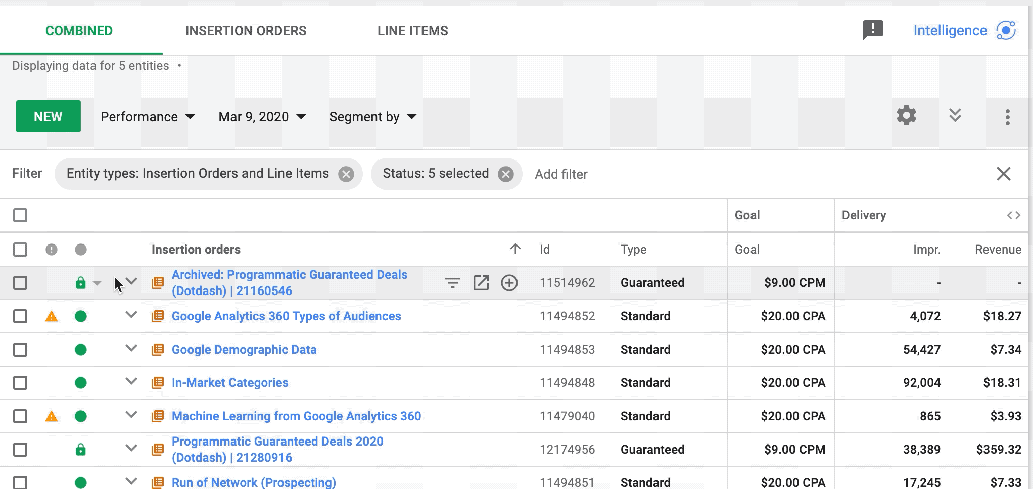 Sehen Sie sich Ihre Kampagnenhierarchie an einem Ort an : Die Registerkarte „Kombiniert" enthält eine hierarchische Liste aller Anzeigenaufträge und Werbebuchungen in Ihrer Kampagne. Sie können Creatives auch in der Zusammenfassungsansicht sehen.